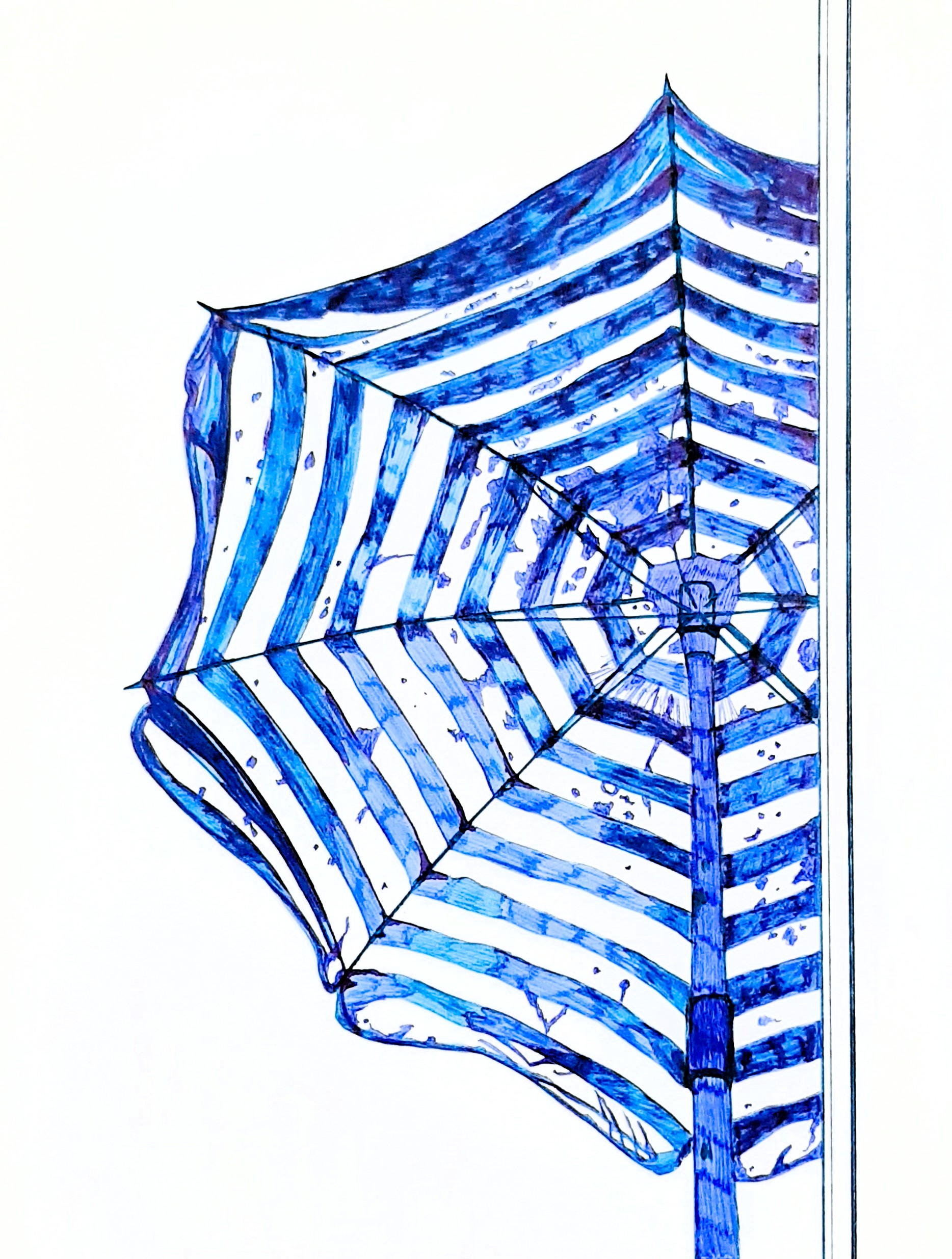 Je réalise des dessins à l’encre et à la plume, principalement en nuances de bleus et de noir.