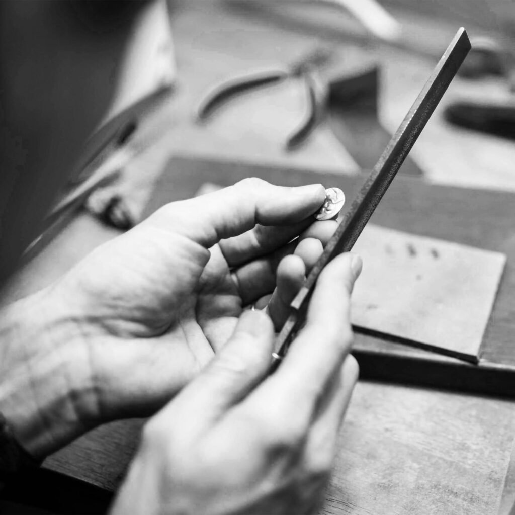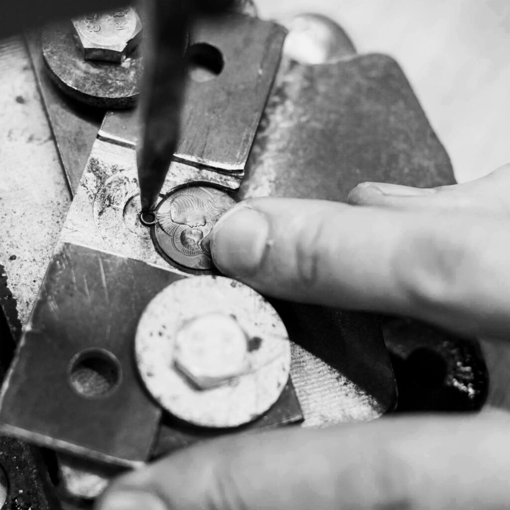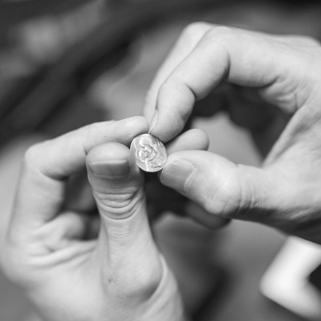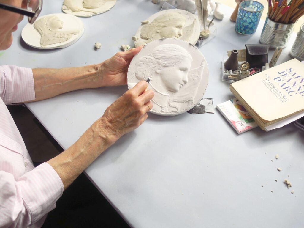 L’atelier Anne-K perpétue la tradition française du modelage et de la gravure de médailles, un art d’une grande finesse mêlant émotion, héritage et spiritualité. Chaque médaille naît d’un long travail manuel : du dessin à la sculpture sur plâtre, jusqu’à la frappe et la dorure.